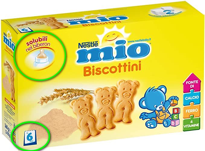 “ I biscottini Nestlè Mio hanno una ricetta appositamente studiata per venire incontro alle esigenze nutrizionali del bambino. Sono indicati dai 6 mesi, secondo il parere del pediatra”.