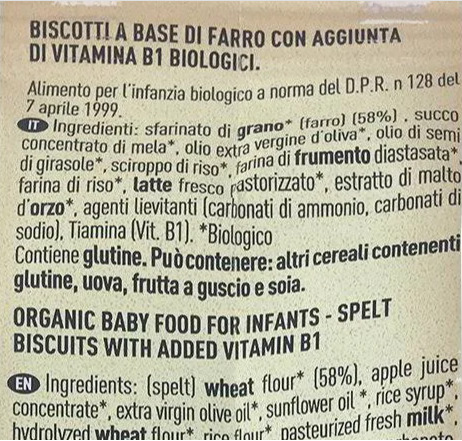 I biscotti biologici impiegano effettivamente ingredienti di migliore qualità, ad esempio vengono dolcificati spesso con succo di mela anziché lo zucchero, o con lo sciroppo di riso. Le farine usate sono da agricoltura biologica quindi più salubri e senza alcun residuo di sostanze chimiche nocive come i pesticidi, i fertilizzanti chimici ecc.. Ma non eliminano un problema fondamentale di fondo: il quantitativo di zuccheri presente nel complesso nell’alimento. Si tratta sempre di biscotti che presentano 20-25 grammi di zuccheri ogni 100g di prodotto. Come già detto, si tratta di una dose pari a 4-5 cucchiaini di zuccheri. Davvero un neonato ha bisogno di un tale quantitativo di xuccheri quando mangia un biscotto? E’ evidente che la risposta è no, anche perché nella farina del biscotto sono già presenti molti amidi che forniscono glucosio una volta avviata la digestione, quindi il fabbisogno di zuccheri sarebbe già ampiamente coperto anche senza l’inserimento di altri zuccheri nel biscotto.