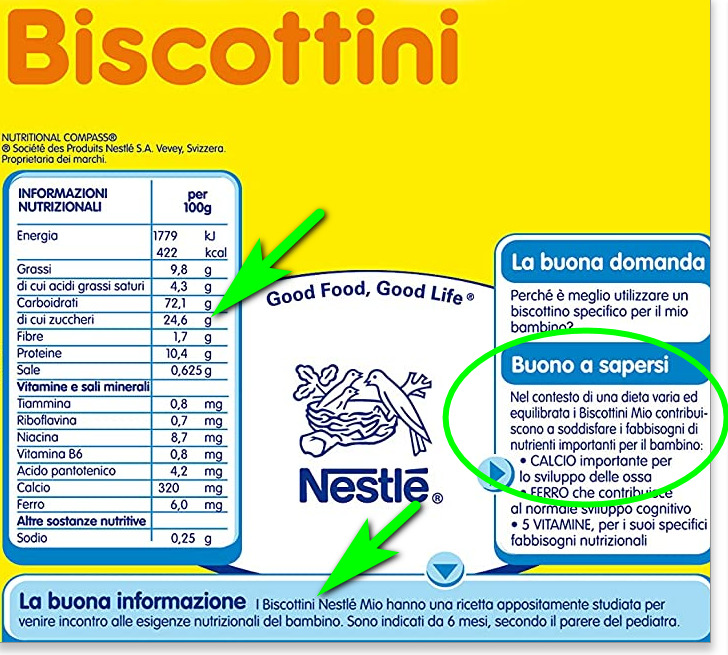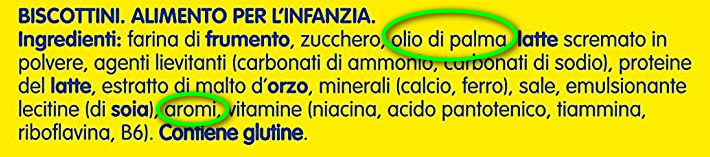 Un genitore più scrupoloso e attento potrebbe voler cercare un prodotto più salutare, con meno zucchero e ingredienti più di qualità, quindi orientarsi per altre marche tra quelle presenti in commercio. Purtroppo anche le aziende concorrenti presentano tutte la stessa filosofia produttiva e una ricetta con ingredienti pressochè identici a quelli del prodotto che abbiamo appena analizzato. Si tratta dunque di una scelta commerciale condivisa da tutti gli attori presenti sul mercato, nessuno escluso. Tutti scelgono di farcire i biscotti per neonati (e gli alimenti per l’infanzia in generale) con abbondanti quantitativi di zucchero (dai 20 ai 25 grammi per 100g di prodotto, una dose pari a 4-5 cucchiaini di zucchero), grassi di cattiva qualità, aromi. E tutte le aziende utilizzano la stessa strategia di apporre in confezione diciture e claims fuorvianti, mirati a garantire una qualità e una idoneità del prodotto nella dieta dei più piccoli, con toni rassicuranti come ad esempio quelli che possiamo leggere sulla confezione del seguente prodotto in foto: