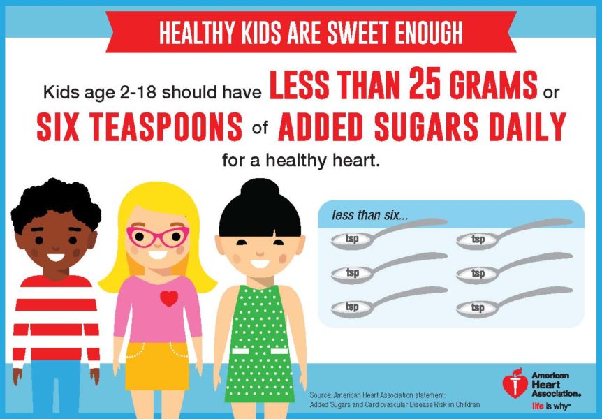 Nel 2015 l’OMS pubblica precise linee guida sul consumo raccomandato di zuccheri. In breve viene detto di ridurre lo zucchero introdotto con la dieta sia negli adulti che nei bambini. L’anno successivo viene pubblicato questo lavoro da parte dell’American Hearth Association in cui espressamente viene detto di non aggiungere zuccheri all’alimentazione dei bambini al di sotto dei 2 anni. Tra i 2 ed i 18 anni consiglia invece di non superare i 25 grammi al giorno (vedi infografica sotto).