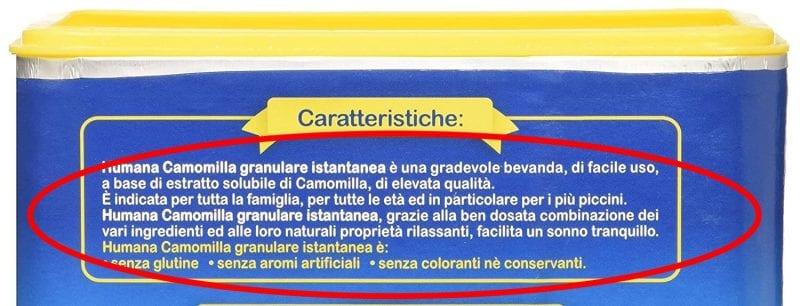 Questo passaggio dice molte cose e lancia un messaggio chiaro: il prodotto è adatto “in particolare per i più piccini”, e “grazie alla ben dosata combinazione dei vari ingredienti” “facilita un sonno tranquillo”. Sono messaggi forti e piuttosto ingannevoli, specialmente considerato che i vari ingredienti “ben dosati” sono i seguenti: zucchero, destrosio, estratto di camomilla (3,6%). Quindi si tratta di 96,4% di zucchero in polvere. Non si comprende davvero dove possano essere le “naturali proprietà rilassanti” millantate sulla confezione del prodotto, se al 97% parliamo di zucchero! Lo zucchero è eccitante, non rilassante, e non concilia il sonno ma anzi attiva la dopamina, noto neurotrasmettitore dello stato di veglia e dell’attenzione.