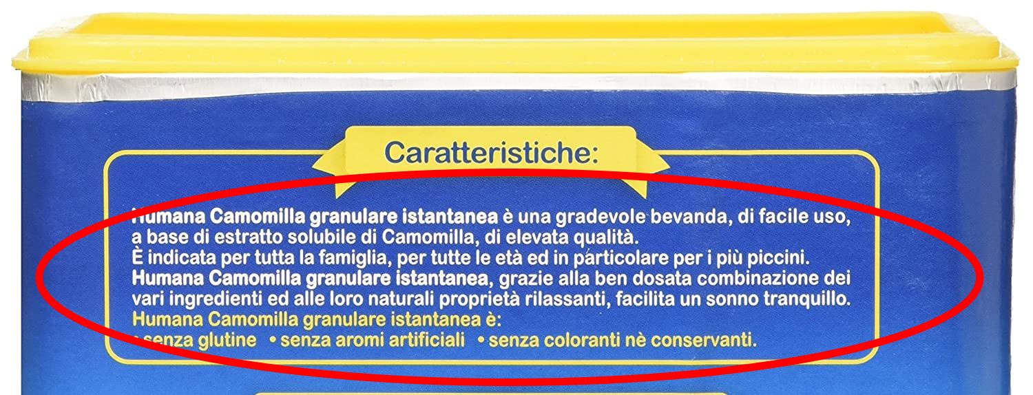 “Humana camomilla granulare istantanea, grazie alla ben dosata combinazione dei vari ingredienti ed alle loro naturale proprietà rilassanti, facilita un sonno tranquillo”