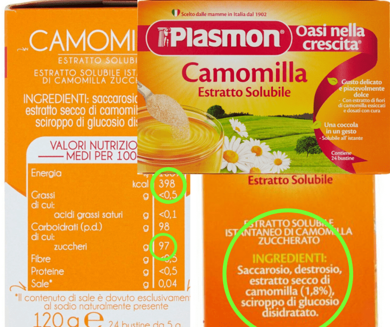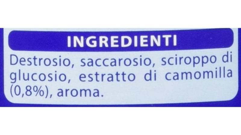 La spiacevolissima sorpresa, quando si guarda più da vicino questi prodotti, è che sono un concentrato di zucchero, destrosio, persino sciroppo di glucosio (in polvere) fino alla dose di 97 grammi su 100g di prodotto! Tanto zucchero in sostanza, e poi una piccola percentuale di estratto di camomilla. E alcune marche inseriscono persino degli aromi artificiali, come se non bastasse.