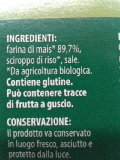 Che il prodotto sia biologico, non ci salva dai danni che comporta l’utilizzo delle farine raffinate (farina di mais) e dello zucchero (sciroppo di riso). Considerate che questo prodotto contiene, in pratica un 90% di farina raffinata di mais (alimento non salutare quando ingerito senza fibre, senza grassi e senza proteine, in quanto alza velocemente la glicemia comportando poi nei bambini, se questo tipo di cereali vengono consumati a colazione, un calo glicemico di rimbalzo e una conseguente perdita di attenzione che conduce a richiesta di altri zuccheri a metà mattina).