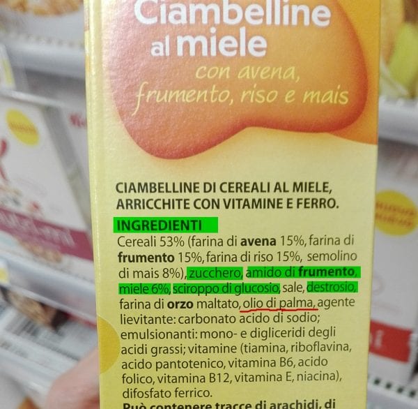 Il miele tanto reclamizzato nella dicitura frontale, è praticamente assente e ci sono anche altri zuccheri oltre al saccarosio, come lo sciroppo di glucosio e il destrosio.