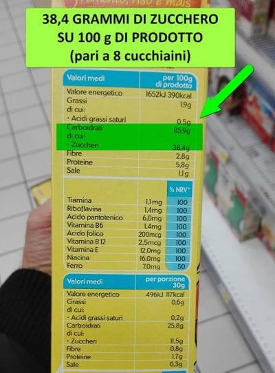 38 grammi di zucchero AGGIUNTO (sottolineiamo il termine “aggiunto”) sono una enormità, pari a 8 cucchiaini di zucchero. Se consideriamo l’intera confezione, da 375 grammi, i contenuti di zucchero aggiunto ammontano a ben 142,5 grammi, ossia pari a 28 cucchiaini di zucchero aggiunto)