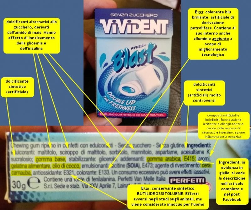 La lista rimanente degli ingredienti è davvero impressionante: dolcificanti artificiali come l’aspartame e l’acesulfame, conservanti e additivi di sintesi come l’E321 (butilidrossitoluene), coloranti artificiali come il blu brillante E133 e poi aromi, cere e gomme di derivazione petrolifera come la gomma base.