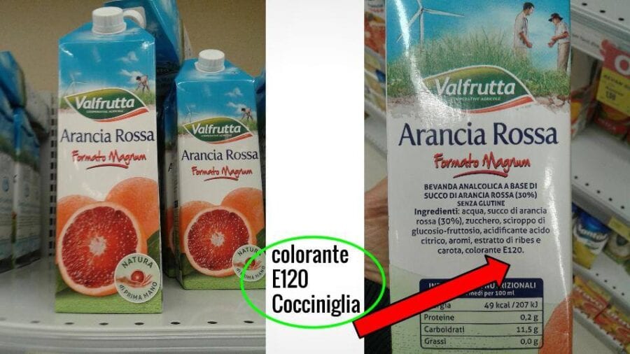 Allora come mai questo colorante è ammesso nei prodotti alimentari, farmaceutici, nella colorazione di tessuti…? Perché appunto nell’impiego di additivi alimentari si presume convenzionalmente (arbitrariamente) che una ristretta dose (quantità) di additivi e sostanze problematiche aggiunte nei prodotti alimentari, entro certi parametri, non possa danneggiare l’intestino e l’organismo umano. E’ da ritenersi un parametro serio e di coscienza per tutelare la salute umana? Noi pensiamo di no. Tutto ciò viene permesso alle industrie alimentari a fini di produttività e risparmio sulle materie prime. E’ chiaro che all’industria costerebbe maggiormente inserire nel prodotto del vero succo di arancia rossa piuttosto che una piccola dose di colorante in polvere o liquido. Tutto ciò viene permesso dalle autorità di controllo sulla sicurezza alimentare (EFSA nell’Unione Europea, con sede a Parma, e FDA per gli Stati Uniti) a causa delle potenti pressioni di lobby e del potere finanziario delle multinazionali dell’industria alimentare, Però prima di dare ai nostri figli un succo di frutta di questo genere (che fra l’altro contiene soprattutto acqua, zucchero e nessuna vitamina, in quanto le vitamine si perdono dopo poche ore dall’estrazione del succo dal frutto e a seguito del trattamento termico di pastorizzazione dei succhi), rifletteteci, ora che sapete. La conoscenza fa la differenza nelle nostre scelte alimentari. Se nessuno ci dice queste cose, noi leggiamo E120 tra gli ingredienti in etichetta e non sappiamo nemmeno cosa stiamo comprando (per quei pochi che leggono le etichette quando fanno la spesa….). Ma nel momento in cui conosciamo queste informazioni possiamo fare una scelta di acquisto libera e volontaria. Possiamo acquistare ugualmente il prodotto oppure lasciarlo intenzionalmente sullo scaffale di modo che a chi l’ha prodotto possa avanzare come rimanenza di magazzino e quindi costituisca un costo di smaltimento o di invenduto!