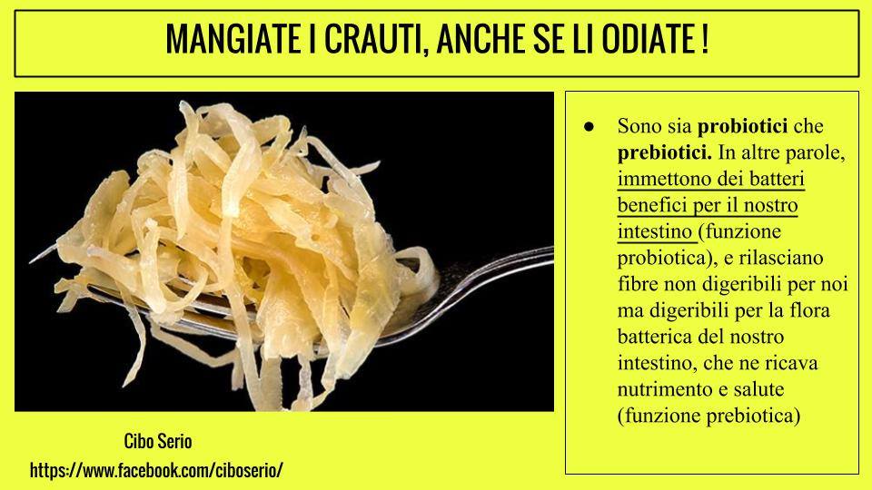 Le verdure fermentate sono sia dei probiotici che dei prebiotici, e apportano un duplice e potente effetto salutare per l’intestino. In altre parole, immettono dei batteri (Lattobacilli) benefici nel nostro intestino (funzione probiotica) e rilasciano fibre non digeribili per noi ma digeribili per la flora batterica del nostro intestino, che ne ricava nutrimento e salute (funzione prebiotica). Forse il sapore può non piacere a tutti, ma mangiare una o due volte al mese queste verdure fermentate dà un grosso aiuto al benessere della pancia, quindi sarebbe da fare come se fosse una terapia, diciamo. Anche se non ci risulta gradito al palato come una coppa di tiramisù… Dunque mangiate i crauti, anche se magari il loro sapore non vi fa impazzire di piacere (a molti piacciono molto, in realtà)!