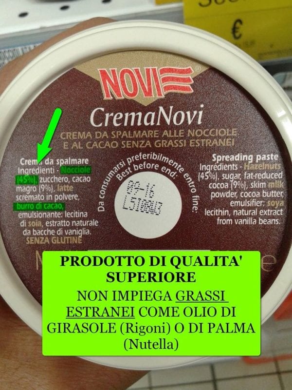 Tutto ciò considerato, fa diventare la Crema Novi un prodotto alimentare di migliore qualità, che non può essere equiparato alla Nocciolata Rigoni, la quale ha un contenuto di nocciole troppo basso (la nocciola è il vero ingrediente di pregio, e costoso, delle creme spalmabili al cacao e nocciole) e che impiega grassi aggiunti come l’olio di girasole e infine lo zucchero come primo ingrediente della ricetta, pertanto come componente principale del prodotto.