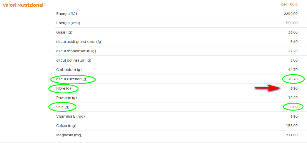 Il contenuto di fibre è doppio nella Crema Novi (6,90 grammi su 100g, rispetto ai 3,60 grammi della Nocciolata). Molto importante la presenza di buoni quantitativi di fibra in prodotti di questo tipo che sono ricchi di zucchero, perchè le fibre tra le varie funzioni hanno quella di andare a bilanciare bene sia l’innalzamento della glicemia nel sangue che l’innalzamento dei valori di colesterolo e trigliceridi.
