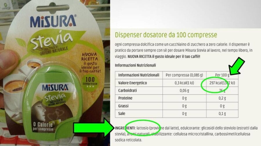 Inoltre il prodotto è uscito all’inizio con la dicitura “zero calorie” e in seguito la dicitura sul frontale del prodotto è stata modificata in “zero calorie per compressa” (dicitura attuale). In entrambi i casi non corrisponde a verità la dichiarazione di “zero calorie”, in quanto il prodotto contiene in effetti delle calorie per compressa e su 100 grammi contiene ben 297 calorie (e non può essere altrimenti, dato che vi è il lattosio nel prodotto, e il lattosio ha le calorie). Quindi non si tratta di un dolcificante a zero calorie, bensì abbiamo a che fare con un prodotto che ne ha circa 300!