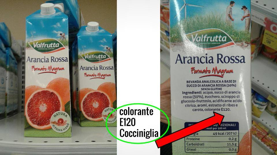 Perchè appunto si presume convenzionalmente e del tutto arbitrariamente che una ristretta dose (quantità) di additivi e sostanze problematiche aggiunte nei prodotti alimentari, entro certi parametri, non possa danneggiare l’organismo umano e creare problemi di tossicità. E’ da ritenersi un parametro serio e di coscienza per tutelare la salute pubblica? Noi pensiamo di no. Tutto ciò viene permesso alle industrie alimentari a fini di produttività e risparmio sulle materie prime. E’ chiaro che all’industria costerebbe di più inserire nel prodotto del vero succo di arancia rossa piuttosto che una polvere colorante di insetto. Tutto ciò viene permesso dalle autorità di controllo sulla sicurezza alimentare (EFSA nell’Unione Europea, con sede a Parma, e FDA per gli Stati Uniti) a causa delle potenti pressioni di lobby e del potere finanziario delle multinazionali dell’industria alimentare, Però prima di dare ai nostri figli un succo di frutta di questo genere (che fra l’altro contiene soprattutto acqua, zucchero e nessuna vitamina, in quanto le vitamine si perdono dopo poche ore dall’estrazione del succo dal frutto e a seguito del trattamento termico di pastorizzazione dei succhi), rifletteteci, ora che sapete. La conoscenza fa la differenza nelle nostre scelte alimentari. Se nessuno ci dice queste cose, noi leggiamo E120 tra gli ingredienti in etichetta e non sappiamo nemmeno cosa stiamo comprando (per quei pochi che leggono le etichette quando fanno la spesa….). Ma nel momento in cui conosciamo queste informazioni possiamo fare una scelta di acquisto libera e volontaria. Possiamo acquistare ugualmente il prodotto oppure lasciarlo intenzionalmente sullo scaffale di modo che a chi l’ha prodotto possa avanzare come rimanenza di magazzino e quindi costituisca un costo di smaltimento o di invenduto!