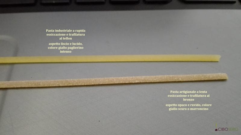 si riconosce molto semplicemente al tatto e alla vista. Qui in foto potete vedere due paste differenti: quella in alto è una linguina industriale (o bavetta), essiccata con alte temperature in tempi rapidi. E’ di colore giallo paglierino intenso, è liscia e lucida. Quella sotto è una linguina di qualità, ed è ruvida e opaca, è stata essiccata lentamente a basse temperature e ha un colore marroncino. La pasta industriale è liscia e lucida, e quella di qualità è opaca. E si nota visivamente anche dalla confezione ancor chiusa, non serve nemmeno aprirla. Al tatto poi la differenza si percepisce in maniera clamorosa. Tutte le paste artigianali sono così (opache e rugose).