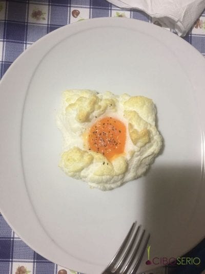 - mettere la cartaforno nella teglia e fare delle montagnette con l’albume montato, con un buchetto sopra per inserire il tuorlo