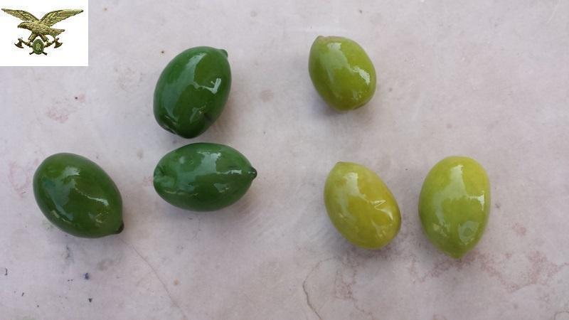 Qui nella immagine: a sinistra le olive verdi col trattamento colorante, a destra l’oliva verde nel suo colore naturale