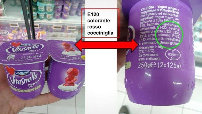 La cocciniglia è un insetto e dalla sua carcassa si ricava un estratto polverizzato di colore rosso carminio, che viene utilizzato come colorante (indicato con la sigla E120 in etichetta) in numerosi prodotti alimentari industriali, dal Campari ai succhi di frutta arancia rossa e agli yogurt alla frutta rossa (fragola, vedi yogurt Danone in foto più in basso). Esistono studi attendibili sulla sicurezza per la salute umana per l’uso di questo colorante ricavato dagli insetti? No, non ce ne sono a dire il vero. Al contrario, nel corso dei decenni ormai (sin dal 1978 si studia questa sostanza), sono stati fatti moltissimi studi per capire quali siano le dosi a cui questo colorante scatena problematiche allergologiche e immunologiche quali asma, allergie, orticaria, e persino shock anafilattico! Se ci sono stati tutti questi studi scientifici e test sulla sostanza (la tossicità è stata rilevata da molti degli studi eseguiti, si veda la ampia bibliografia che lasciamo a fine articolo), ciò è a conferma del fatto che non si tratta certamente di una sostanza innocua come potrebbe sembrare (il fatto che una sostanza sia di origine naturale non significa che sia esente da problematiche per la salute). Se invece si trattasse di un colorante come l’estratto di mirtillo o di barbabietola rossa, poniamo, le problematiche di salute e allergie sarebbero pari a zero. Questi ultimi due coloranti naturali iniziano infatti oggi ad essere impiegati come coloranti alternativi e più sicuri della cocciniglia negli alimenti, assieme ad altri estratti naturali come il betacarotene, la curcuma o la paprika.