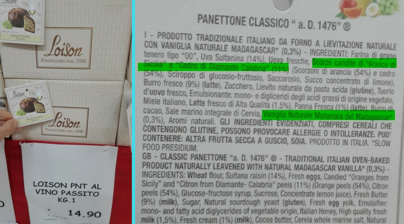 Un buon panettone si riconosce anche da questo. Se ci sono meno burro e meno uova, allora avremo più farina e più zucchero e chiaramente la qualità sarà inferiore. Le altre differenze importanti riguardano il tempo di lievitazione – da 24 a 72 ore – e la qualità di alcune materie prime. Vediamo meglio: la frutta candita (arancia e cedro) può essere italiana, spagnola o arrivare dal Sud America. Per le arance si può scegliere tra scorza o scorzone (più pregiato). Uno dei prodotti migliori sotto questo aspetto è il panettone Loison (qui sotto in foto), prodotto da una azienda artigianale di Vicenza, che è possibile trovare in alcuni supermercati come, per esempio, Conad. Leggiamo tra gli ingredienti la presenza di scorza di arance di Sicilia e di scorzoni di cedro diamante della Calabria, oltre al sale marino integrale di Cervia e alla vera vaniglia del Madagascar. Certo, il prezzo si fa sentire e siamo sulle 15,00 euro a pezzo!
