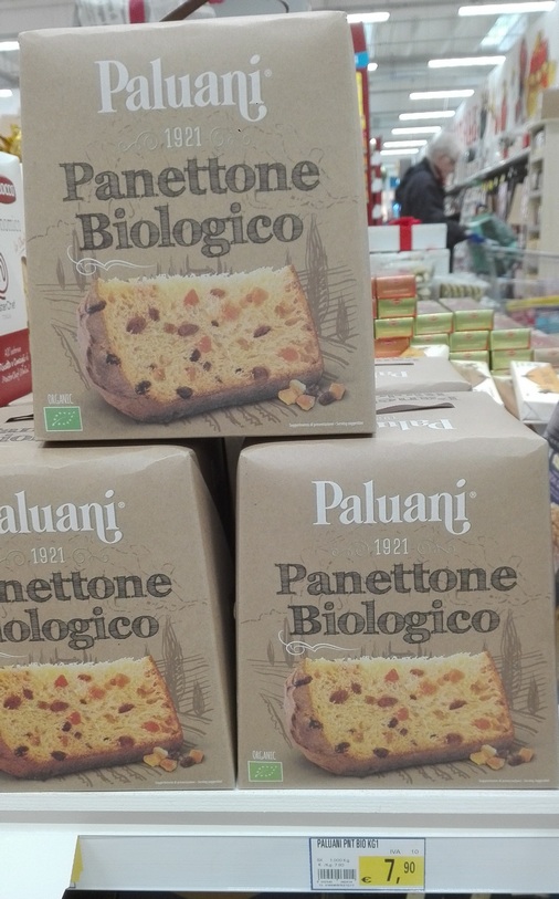 Possiamo optare anche per dei panettoni e pandori biologici, stessi ingredienti, ma con farine bio, burro bio, ecc. La differenza di prezzo rispetto ad uno convenzionale non è marcata, si veda l’esempio del Panettone Paluani qui in foto.