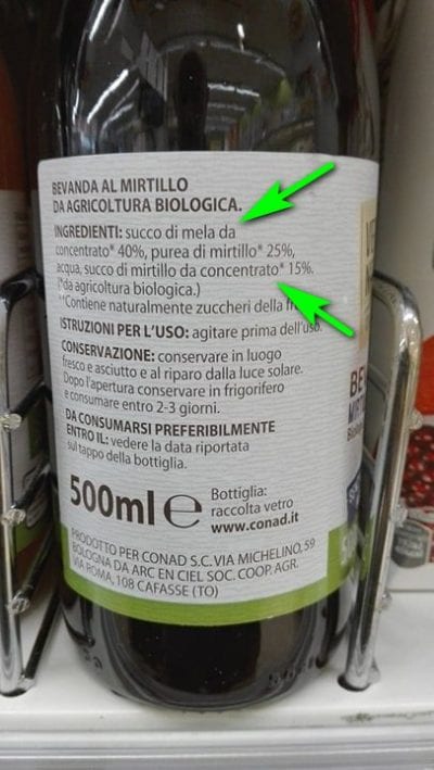 In definitiva questo prodotto si spaccia come un succo di mirtillo, naturale e senza zuccheri, ma la realtà dei fatti è che il primo ingrediente è il succo di mela da concentrato, per ben il 40% del totale del prodotto. Poi anche il succo di mirtillo da concentrato ammonta al 15% e pertanto in questa bottiglia il 55% del totale è composto da zuccheri aggiunti ! Solo il 25% del composto è purea di mirtillo, il resto è acqua. Ricapitolando: