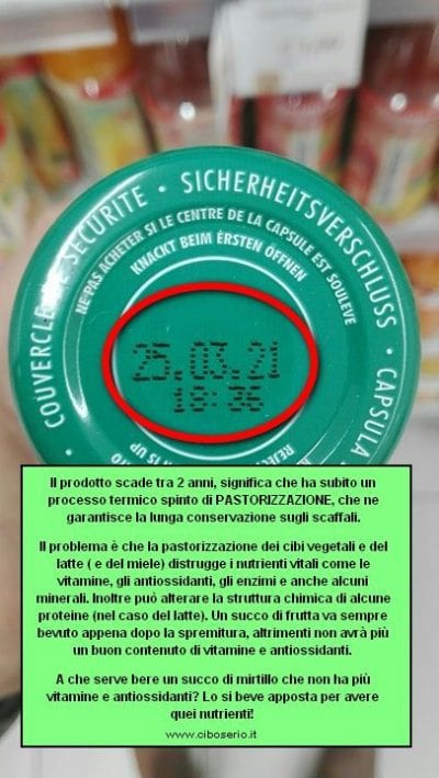 Il prodotto scade tra 2 anni (vedi foto in basso), significa che ha subito un processo spinto di pastorizzazione, che ne garantisce la lunga conservazione sugli scaffali. Il problema è che la pastorizzazione dei cibi vegetali, del latte e del miele, distrugge i nutrienti vitali come le vitamine, gli antiossidanti, gli enzimi e anche alcuni minerali. Inoltre può alterare la struttura chimica di alcune proteine (nel caso del latte). Un succo di frutta va sempre consumato appena dopo la spremitura e preparazione, altrimenti avrà perso tutto il suo contenuto di vitamine e antiossidanti. A cosa serve bere un succo di mirtillo che non ha più vitamine e antiossidanti. un succo di mirtillo lo si cerca apposta per avere quei nutrienti!