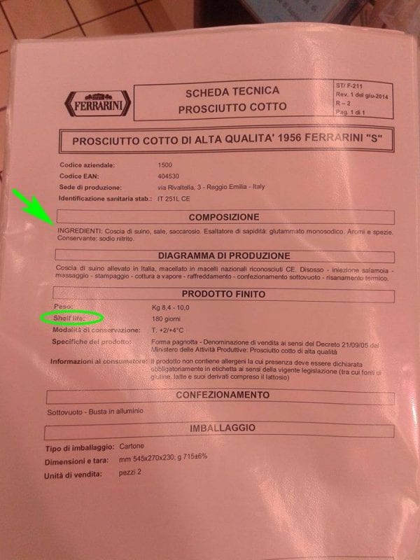 Ultimissima annotazione: la shelf life di questo tipo di prosciutti, ovvero i tempi di conservazione, sono di circa 180 giorni (si veda l’immagine che riporta la scheda tecnica). E’ evidente che chi producesse salumi biologici senza conservanti (oltre al sale) potrebbe garantire solo tempi di conservazione più brevi, magari di un mese o due al massimo. Questa sarebbe esattamente la soluzione ideale per il consumatore per la salute e per il consumo di un alimento davvero sano. Le aziende tradizionali e con produzione industriale invece producono prodotti che possono conservarsi a lungo, in questo modo riescono a piazzarli sul mercato in tutto il mondo e aumentare i profitti. La produzione su scala industriale, in grandi quantità, non si potrebbe avere con un salume artigianale privo di conservanti che scade dopo due mesi, il quale sarebbe destinato al massimo ad un mercato locale. Quello però sarebbe esattamente un salume salutare. E guarda caso se ci pensiamo è proprio il tipo di salume che si produceva una volta nelle case per un uso familiare e stagionale. Ancora oggi ovviamente ci sono dei salumieri che producono salumi senza zucchero, aromi, esaltatori di sapore e conservanti. Non se li fila più nessuno però! Tutti a prendere il bigliettino al banco salumi del supermercato perchè la spesa si fa di corsa e non si può sottrarre tempo alle ore di lavoro dell’ufficio o ad altri eventi mondani come aperitivi, cene di lavoro, ecc. E la salute?