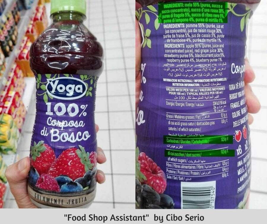 infatti ha ben 125 grammi di zuccheri per un litro di prodotto, una quota pari a 25 cucchiaini di zucchero !!!! E’ ricchissimo di zucchero sia per la tecnologia di produzione (si preparano solitamente a partire dal concentrato, che è ottenuto facendo evaporare l’acqua del succo per far rimanere solo il concentrato degli zuccheri) e sia perchè in questo prodotto che mostriamo in foto, nello specifico, viene aggiunto del succo concentrato di mela e del succo d’uva.